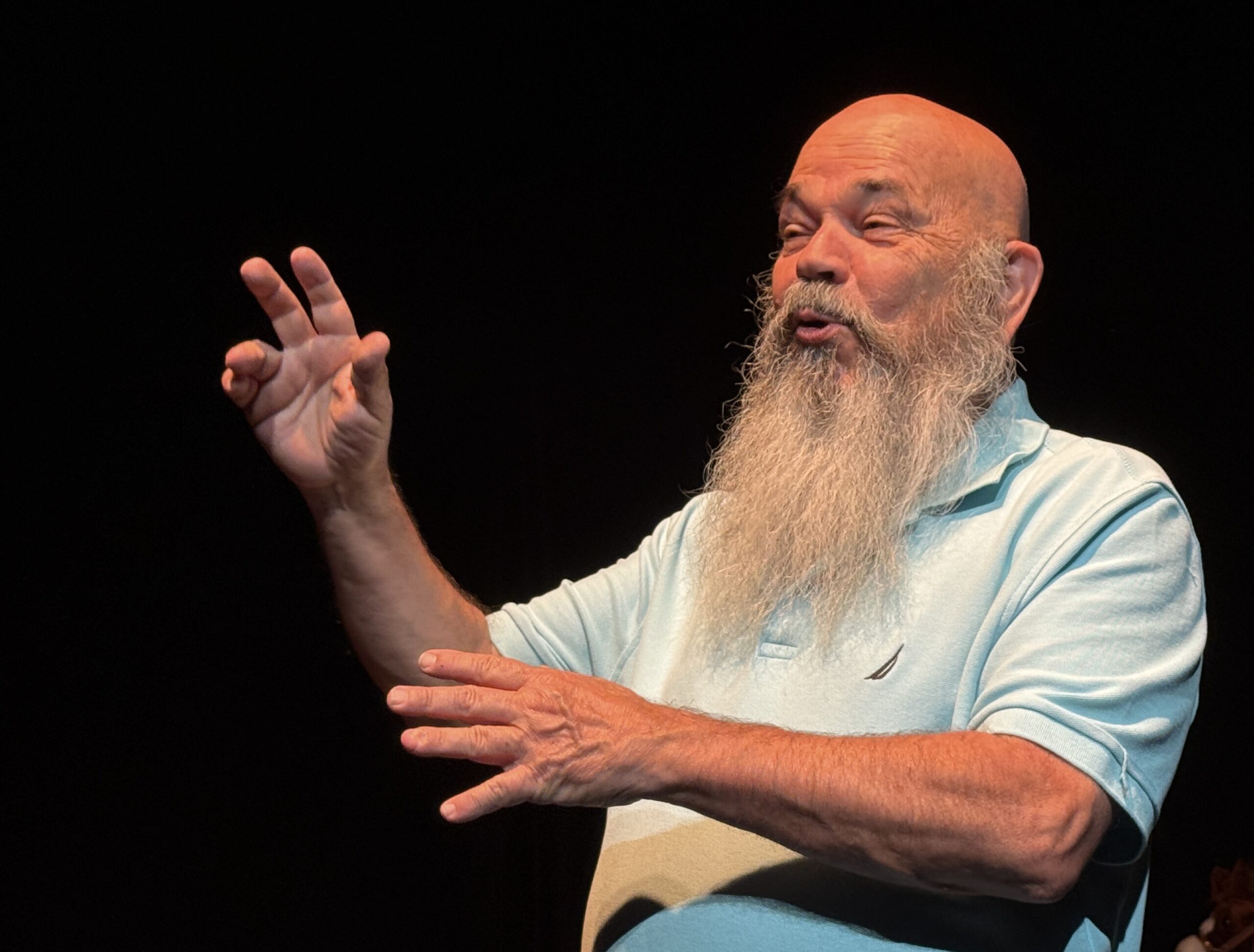 [Descripción de la imagen: Un hombre latino se encuentra en el escenario, atrapado en medio de una frase. Lleva una camiseta polo de color azul claro. Tiene la cabeza calva, una larga barba blanca y su atención se dirige a algo fuera de cuadro a la izquierda. Sus brazos son salvajes, gesticulantes. Su brazo derecho está algo levantado y un par de dedos curvados. Su brazo izquierdo está inclinado frente a su cuerpo, con los dedos extendidos. Detrás de él como una nada negra.]