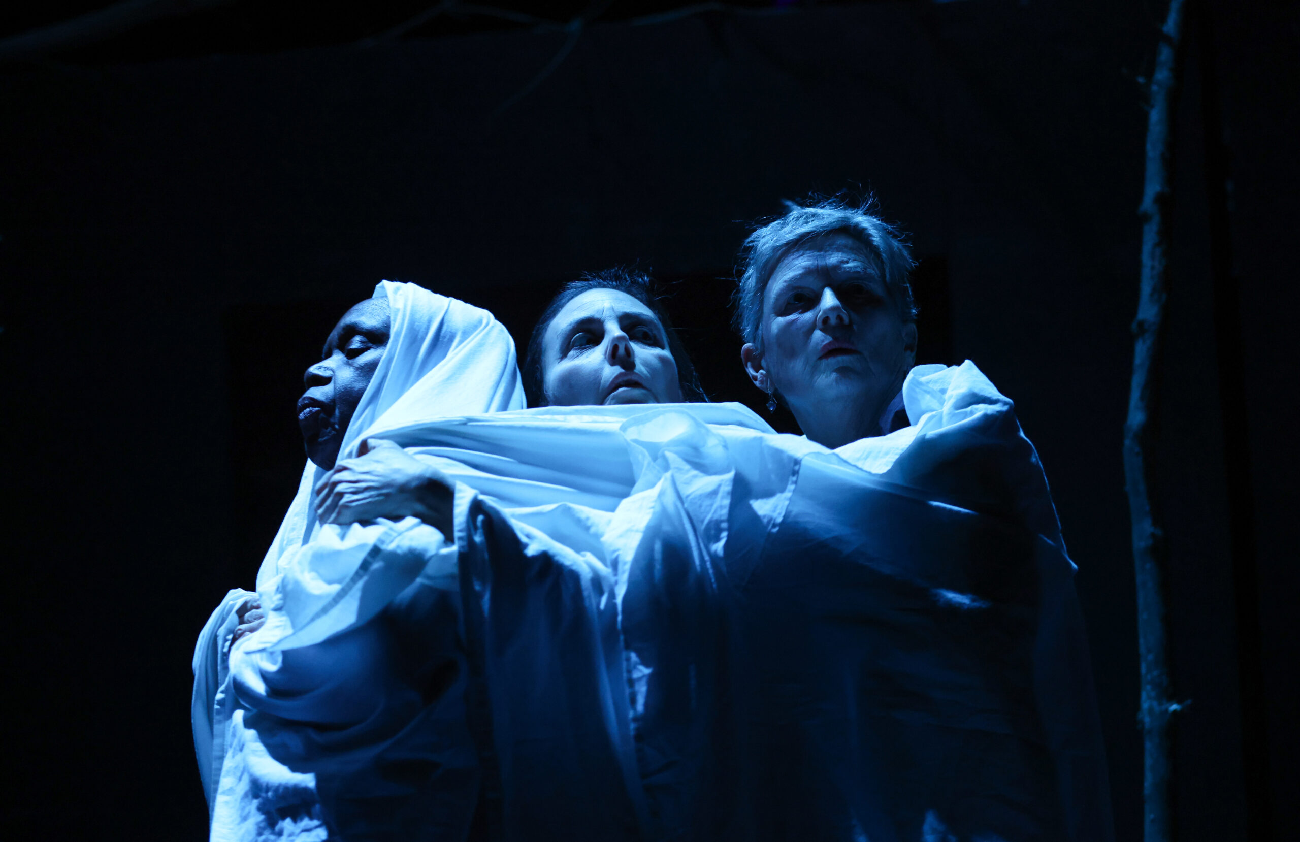 [Image description: Three women are huddled together wrapped up in white fabric. The woman on the left faces to the left, the fabric covering the top of her head and draping down the rest of her body. The woman in the middle faces up. Everything below her chin has been enveloped by the fabric. The woman on the right faces us, with the white fabric covering everything below her neck. The three figures are bathed in a blue light, and surrounded by a black void.]