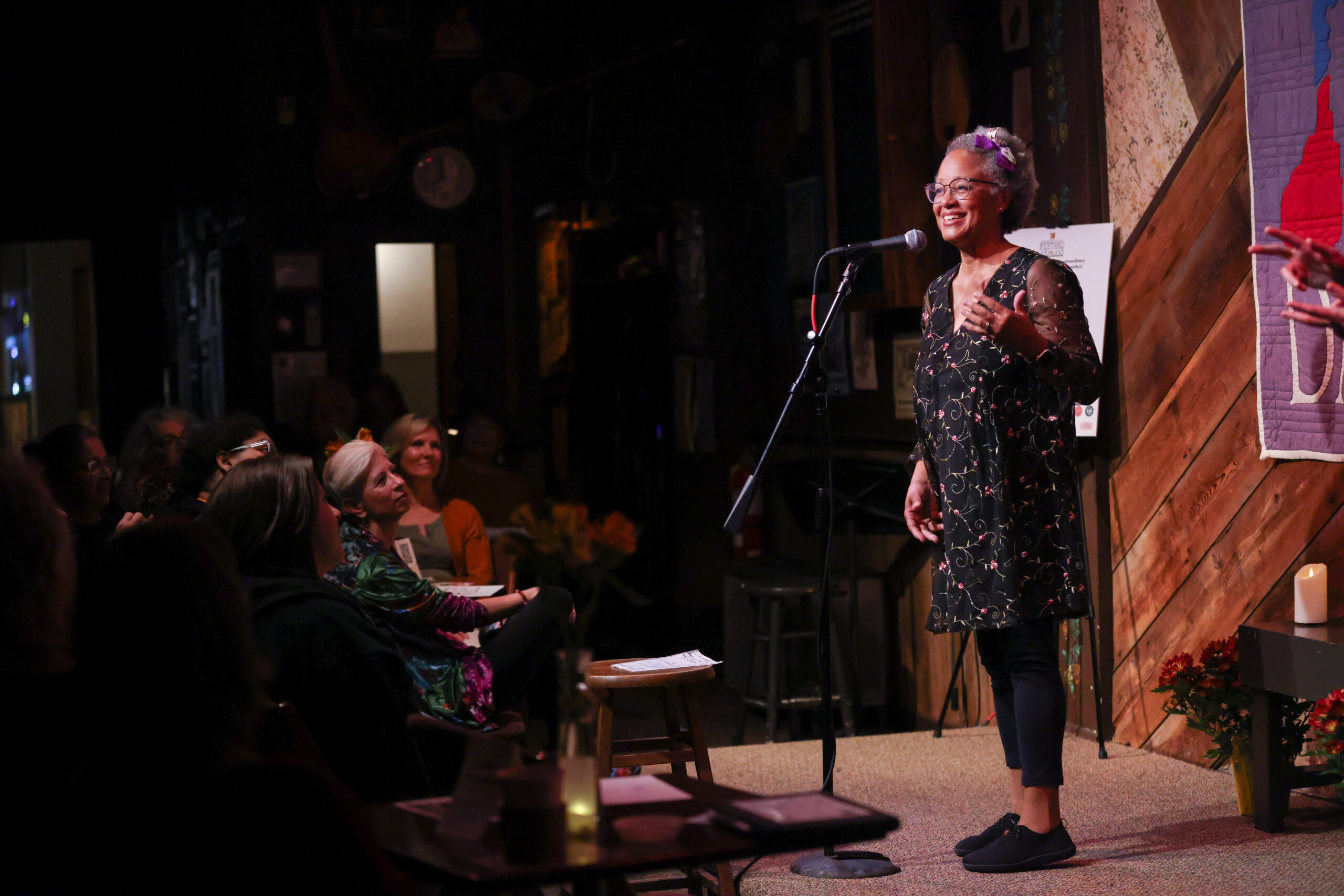 [Image description: A female presenting figure stands on a stage in an intimate venue. She is a Black woman, wearing a black dress, patterned with pink flowers, black leggings, black shoes, glasses, and sports a purple bow in her short grey hair. A microphone is on a stand in front of her, along with a brown stool with a sheet of paper on it. She speaks out to the crowd, in the middle of telling a story. The crowd, about 50 or so people of all kinds, stare back at her in rapt attention. We see that the walls of this room are covered with it’s history. Posters, photos, newspaper articles, even instruments document the hundreds of performers who have played on this very stage.] Photo by VillaNovak Creative.